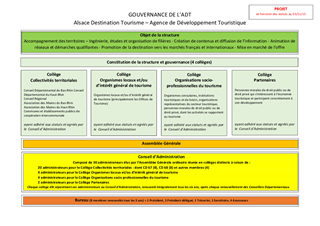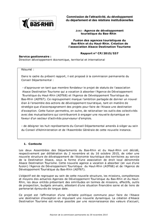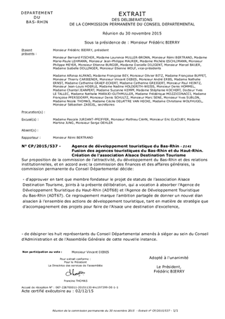 Dans le cadre du présent rapport, il est proposé à la commission permanente du Conseil Départemental : - d’approuver en tant que membre fondateur le projet de statuts de l’association Alsace Destination Tourisme qui a vocation à absorber l’Agence de Développement Touristique du Haut-Rhin (ADT68) et l’Agence de Développement Touristique du Bas-Rhin (ADT67). Ce regroupement marque l’ambition partagée de donner un nouvel élan à l’ensemble des actions de développement touristique, tant en matière de stratégie que d’accompagnement des projets pour faire de l’Alsace une destination d’exception. Cette fusion permettra, en outre, de rationaliser les outils des collectivités avec des mutualisations qui contribueront à engager une nouvelle dynamique en faveur d’un secteur d’activités pourvoyeur d’emplois. - de désigner les huit représentants du Conseil Départemental amenés à siéger au sein du Conseil d’Administration et de l’Assemblée Générale de cette nouvelle instance.