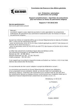 Le présent rapport a pour objet de soumettre à votre approbation les propositions d’attribution de subventions aux paroisses et associations pour les travaux en faveur du patrimoine religieux.
