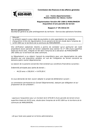 Le présent rapport a pour objet de soumettre à votre approbation les modalités d'acquisition à titre de régularisation d'une parcelle de terrain située dans l'emprise de la RD 1004 sur le territoire de la commune de MARLENHEIM.