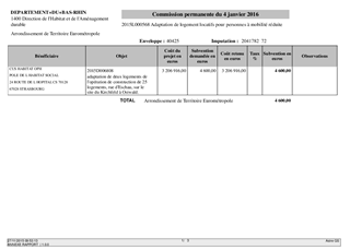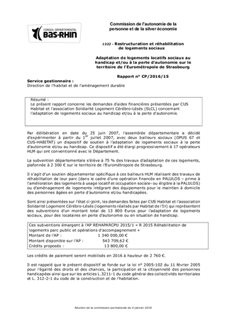 Le présent rapport concerne les demandes d'aides financières présentées par CUS Habitat et l'association Solidarité Logement Cérébro-Lésés (SLCL) concernant l'adaptation de logements sociaux au handicap et/ou à la perte d'autonomie.