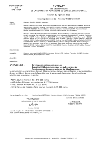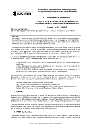 Le présent rapport a pour objet de soumettre à l'avis de la commission permanente du Conseil Départemental l'attribution, dans l'attente du vote du budget primitif de 2016, d'acomptes sur les subventions à différents organismes de développement, partenaires habituels de la collectivité départementale bas-rhinoise.