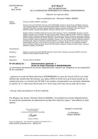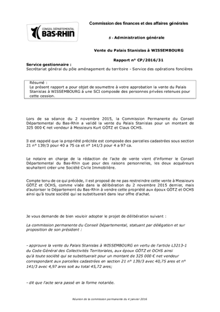 Le présent rapport a pour objet de soumettre à votre approbation la vente du Palais Stanislas à WISSEMBOURG à une SCI composée des personnes privées retenues pour cette cession.