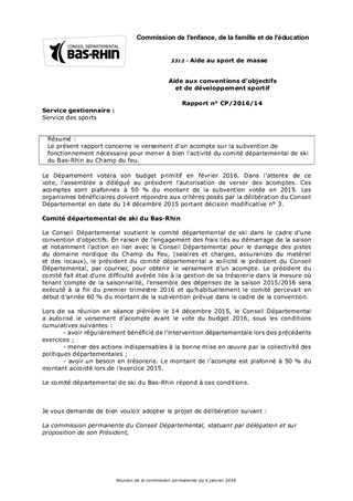 Le présent rapport concerne le versement d’un acompte sur la subvention de fonctionnement nécessaire pour mener à bien l’activité du comité départemental de ski du Bas-Rhin au Champ du feu.