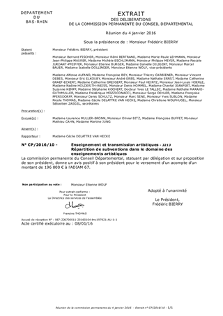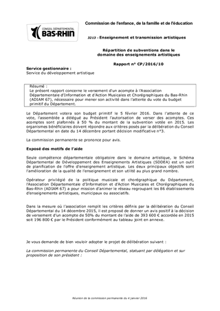 Le présent rapport concerne le versement d'un acompte à l'Association Départementale d'Information et d'Action Musicales et Chorégraphiques du Bas-Rhin (ADIAM 67), nécessaire pour mener son activité dans l'attente du vote du budget primitif du Département.