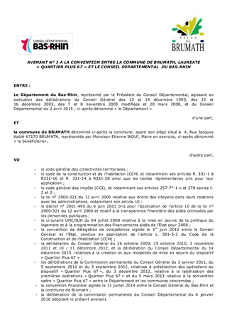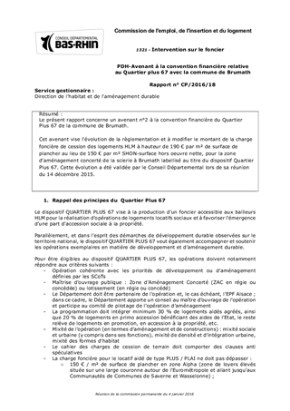 Le présent rapport concerne un avenant n°2 à la convention financière du Quartier Plus 67 de la commune de Brumath. Cet avenant vise l'évolution de la règlementation et à modifier le montant de la charge foncière de cession des logements HLM à hauteur de 190 € par m² de surface de plancher au lieu de 150 € par m² SHON-surface hors oeuvre nette, pour la zone d'aménagement concerté de la scierie à Brumath labellisé au titre du dispositif Quartier Plus 67. Cette évolution a été validée par le Conseil Départemental lors de sa réunion du 14 décembre 2015.