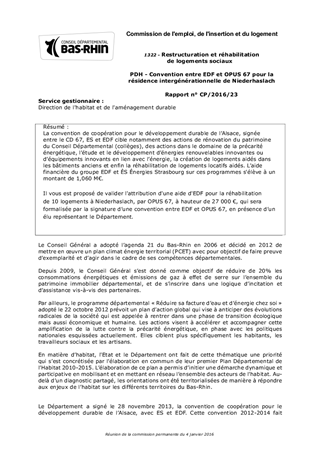 La convention de coopération pour le développement durable de l’Alsace, signée entre le CD 67, ES et EDF cible notamment des actions de rénovation du patrimoine du Conseil Départemental (collèges), des actions dans le domaine de la précarité énergétique, l’étude et le développement d’énergies renouvelables innovantes ou d’équipements innovants en lien avec l’énergie, la création de logements aidés dans les bâtiments anciens et enfin la réhabilitation de logements locatifs aidés. L’aide financière du groupe EDF et ÉS Énergies Strasbourg sur ces programmes s'élève à un montant de 1,060 M€. Il vous est proposé de valider l'attribution d'une aide d'EDF pour la réhabilitation de 10 logements à Niederhaslach, par OPUS 67, à hauteur de 27 000 €, qui sera formalisée par la signature d’une convention entre EDF et OPUS 67, en présence d’un élu représentant le Département.