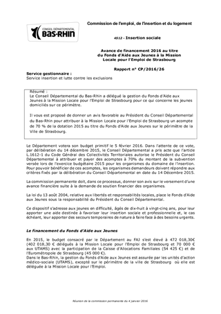 Avance de financement 2016 au titre du Fonds d'Aide aux Jeunes à la Mission Locale pour l'Emploi de Strasbourg