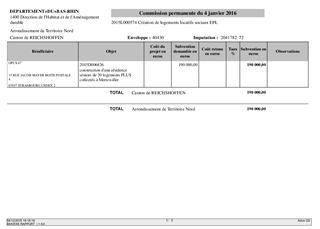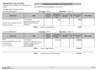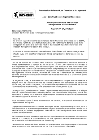 Le présent rapport concerne les demandes d’aide financière présentées par la SIBAR, BATIGERE, l’OPUS 67 et la FONCIERE HABITAT ET HUMANISME dans le cadre de la délégation des aides à la pierre de l’Etat et du dispositif départemental d’aide à la création de logements locatifs très sociaux. A ce titre, 8 dossiers relatifs à des opérations financées en prêt locatif à usage social (PLUS) et/ou prêt locatifs d’Intégration (PLAI), sont présentés dans les annexes au rapport.