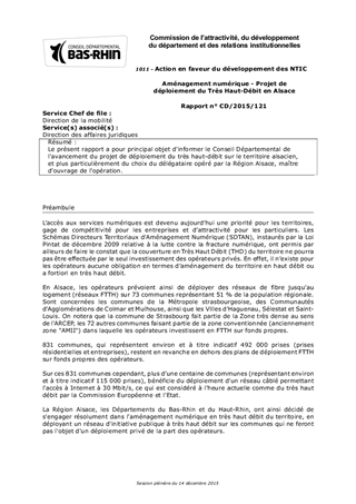 Le présent rapport a pour principal objet d'informer le Conseil Départemental de l'avancement du projet de déploiement du très haut-débit sur le territoire alsacien, et plus particulièrement du choix du délégataire opéré par la Région Alsace, maître d'ouvrage de l'opération.