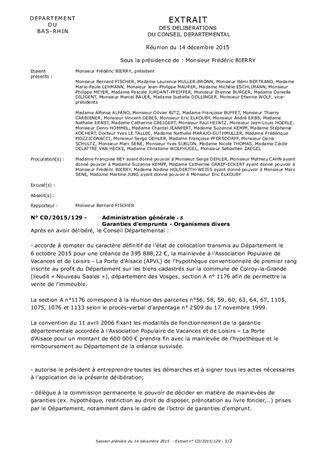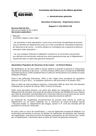 Le présent rapport a pour objet : - de soumettre à votre approbation l’octroi d’une mainlevée d’hypothèque de premier rang au bénéfice du Département prise sur le bien propriété de l’Association Populaire de Vacances et de Loisirs - La Porte d’Alsace en contrepartie de la garantie d’emprunt octroyée à cette association ; - de vous proposer d’étendre la délégation consentie à la commission permanente aux décisions de mainlevées relatives aux contre-garanties prises par le Département notamment dans le cadre des garanties d’emprunt