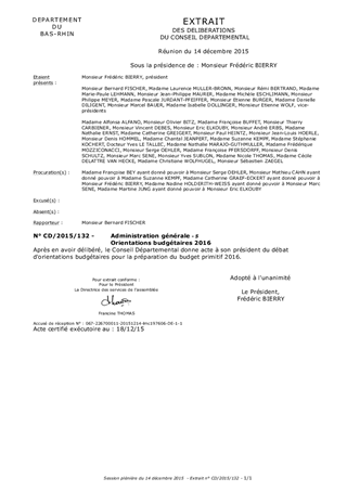 Orientations budgétaires 2016 Resumé Ce rapport présente les orientations budgétaires pour 2016. Pièces jointes Délibération Rapport Assemblée : Conseil Departemental Date : 14/12/2015 Rapporteur : Monsieur Bernard FISCHER Collectivité : Conseil départemental du Bas-Rhin Direction : Direction des finances et de la commande publique Service : Service du budget et de la dette Domaine : Non renseigné Commission : 1 - Commission des finances et des affaires générales