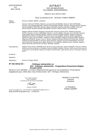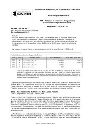 L’Alsace dispose de nombreux sites, liés à son histoire, dont la richesse mérite que l’on s’y attarde particulièrement. La politique mémorielle, à laquelle contribue le département, s’inscrit dans une démarche volontariste de faire vivre la mémoire, au travers notamment du syndicat mixte du Mémorial de l’Alsace–Moselle et d’actions variées. Ce rapport propose d'inscrire au budget primitif 2016 un crédit de 73 500,00 €.