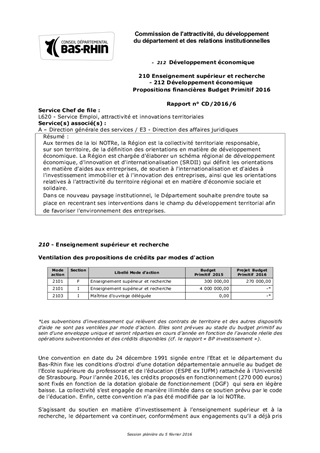 210 Enseignement supérieur et recherche - 212 Développement économique Propositions financières Budget Primitif 2016