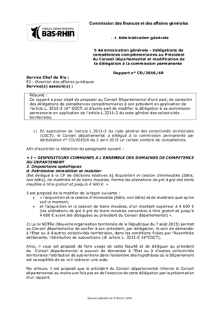 Ce rapport a pour objet de proposer au Conseil Départemental d’une part, de consentir des délégations de compétences complémentaires à son président en application de l’article L. 3211-2 16° CGCT, et d’autre part de modifier la délégation à sa commission permanente en application de l'article L.3211-2 du code général des collectivités territoriales.