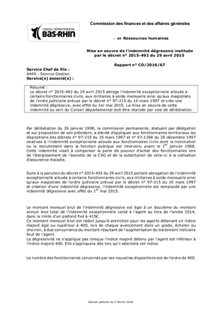 Le décret n° 2015-492 du 29 avril 2015 abroge l'indemnité exceptionnelle allouée à certains fonctionnaires civils, aux militaires à solde mensuelle ainsi qu'aux magistrats de l'ordre judiciaire prévue par le décret n° 97-215 du 10 mars 1997 et crée une indemnité dégressive, avec effet du 1er mai 2015. La mise en oeuvre de cette indemnité au sein du Conseil départemental doit être réalisée par voie de délibération.