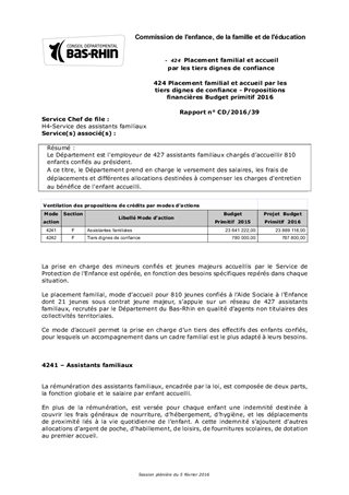 424 Placement familial et accueil par les tiers dignes de confiance - Propositions financières Budget primitif 2016