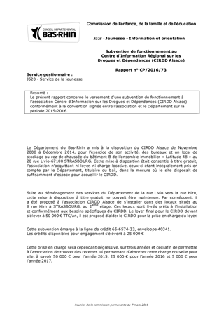 Le présent rapport concerne le versement d'une subvention de fonctionnement à l'association Centre d'Information sur les Drogues et Dépendances (CIRDD Alsace) conformément à la convention signée entre l'association et le Département sur la période 2015-2016.