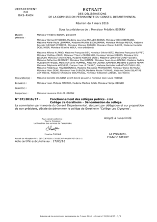 Conformément à l'article L 421-24 du code de l'éducation, le Département est chargé d'arrêter la dénomination des collèges. Le rapport a pour objet de dénommer le collège de Gerstheim "Collège Les Cigognes".