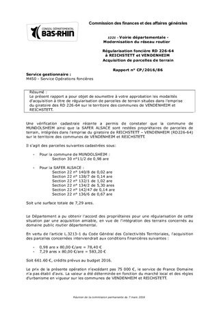 Régularisation foncière RD 226-64 à REICHSTETT et VENDENHEIM Acquisition de parcelles de terrain