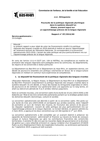 Le présent rapport a pour objet de voter les financements relatifs à la politique régionale des langues vivantes en 2016 destinés à mettre en œuvre l’apprentissage de l’allemand relevant de l’Education Nationale. Ils correspondent à la convention opérationnelle 2015-2018. L’accent de cette politique est plus particulièrement mis sur l’apprentissage précoce de la langue régionale.