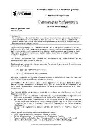 Le présent rapport a pour objet de proposer un programme de travaux de maintenance dans les bâtiments départementaux hors collèges pour l’année 2016. Le document joint en annexe détaille les opérations correspondant aux enveloppes budgétaires qui ont été votées au Budget Primitif.