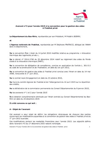 PDH-Avenant n°3 pour l'année 2015 à la convention de gestion des aides de l'Agence Nationale de l'Habitat (ANAH)