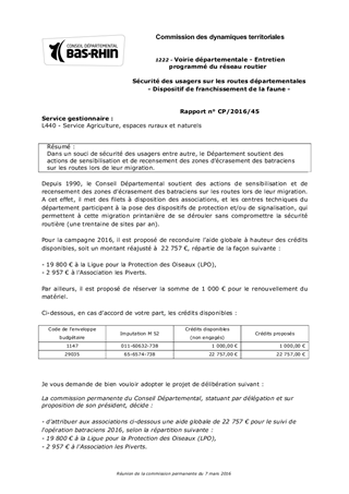 Dans un souci de sécurité des usagers entre autre, le Département soutient des actions de sensibilisation et de recensement des zones d’écrasement des batraciens sur les routes lors de leur migration.