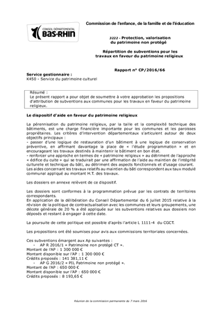 Le présent rapport a pour objet de soumettre à votre approbation les propositions d’attribution de subventions aux communes pour les travaux en faveur du patrimoine religieux.
