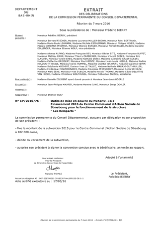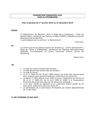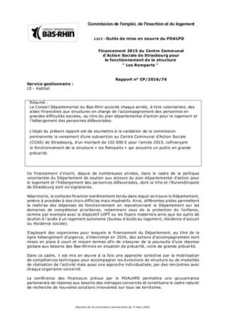 Le Conseil Départemental du Bas-Rhin accorde chaque année, à titre volontariste, des aides financières aux structures en charge de l'accompagnement des personnes en grandes difficultés sociales, au titre du plan départemental d'action pour le logement et l'hébergement des personnes défavorisées. L’objet du présent rapport est de soumettre à la validation de la commission permanente le versement d’une subvention au Centre Communal d’Action Sociale (CCAS) de Strasbourg, d’un montant de 102 000 € pour l’année 2015, cofinançant le fonctionnement de la structure « les Remparts » qui accueille un public en grande précarité.