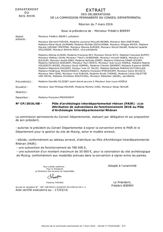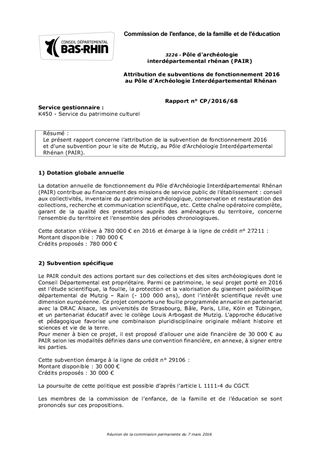 Le présent rapport concerne l’attribution de la subvention de fonctionnement 2016 et d’une subvention pour le site de Mutzig, au Pôle d'Archéologie Interdépartemental Rhénan (PAIR).
