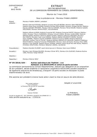 Le présent rapport concerne l'adhésion du Département à la SOCOLOPO (société coopérative de logements populaires de Strasbourg) et l'achat de parts sociales à hauteur de 10 euros. Cet organisme HLM est une association coopérative disposant d'environ 1 800 logements sur le territoire de l'Eurométropole de Strasbourg. Conformément aux statuts de la SOCOLOPO, le Département sera membre de droit du conseil d'administration.