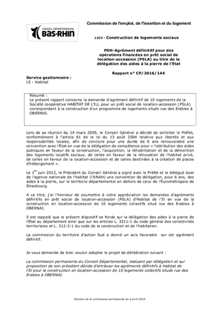 Le présent rapport concerne la demande d’agrément définitif de 10 logements de la Société coopérative HABITAT DE L’ILL pour un prêt social de location-accession (PSLA) correspondant à la construction d’un programme de logements situés rue des Erables à OBERNAI.