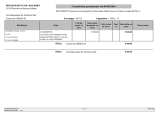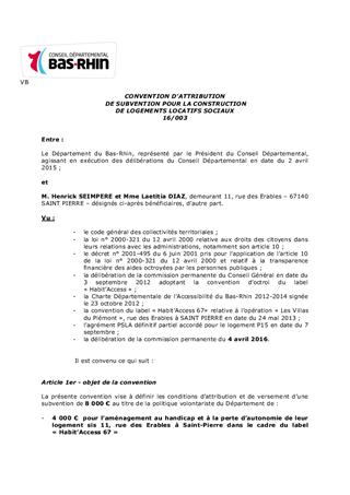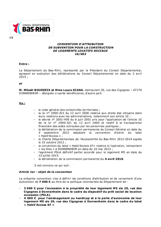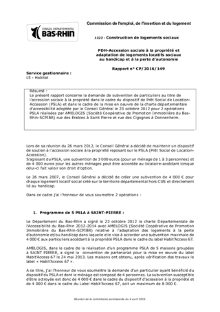 Le présent rapport concerne la demande de subvention de particuliers au titre de l’accession sociale à la propriété dans le cadre du dispositif de Prêt Social de Location-Accession (PSLA) et dans le cadre de la mise en oeuvre de la charte départementale d’accessibilité adoptée par le Conseil Général le 23 octobre 2012 pour 2 opérations PSLA réalisées par AMELOGIS (Société Coopérative de Promotion Immobilière du Bas-Rhin-SCPIBR) rue des Erables à Saint Pierre et rue des Cigognes à Donnenheim.