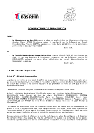 Le présent rapport porte sur la conclusion de deux conventions annuelles entre le Département et les associations Vélo Emploi et CADR 67, pour l'année 2016. Ces associations interviennent de manière complémentaire pour contrôler les vélos et sensibiliser à la sécurité routière dans les collèges du Bas-Rhin.