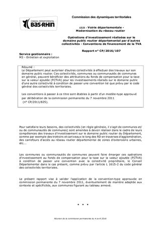 Le Département peut autoriser d’autres collectivités à effectuer des travaux sur son domaine public routier. Ces collectivités, communes ou communautés de communes en général, peuvent bénéficier des attributions du fonds de compensation pour la taxe sur la valeur ajoutée (FCTVA) pour les investissements réalisés sur le domaine public d’une autre collectivité à condition de passer une convention tel que prévu par le code général des collectivités territoriales. Les conventions à passer à ce titre sont établies à partir d’un modèle-type approuvé par délibération de la commission permanente du 7 novembre 2011 (n° CP/2011/825).