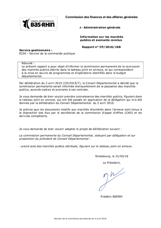 Le présent rapport a pour objet d’informer la commission permanente de la conclusion des marchés publics décrits dans le tableau joint en annexe, et qui correspondent à la mise en œuvre de programmes et d’opérations identifiés dans le budget départemental.