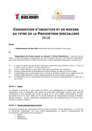 Convention d'objectifs et de moyens au titre de la prévention spécialisée - 2016 - Centre socio-culturel Victor Schoelcher -