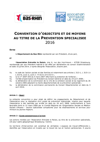 Convention d'objectifs et de moyens au titre de la prévention spécialisée - 2016 - Association Entraide le Relais -