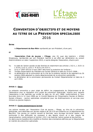 Convention d'objectifs et de moyens au titre de la prévention spécialisée - 2016 - Association Club de jeunes – l’Etage -