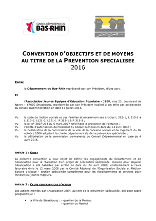 Convention d'objectifs et de moyens au titre de la prévention spécialisée - 2016 - Association Jeunes Equipes d’Education Populaire - JEEP -