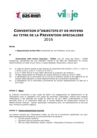Convention d'objectifs et de moyens au titre de la prévention spécialisée - 2016 - Association Ville Action Jeunesse - VilAJe