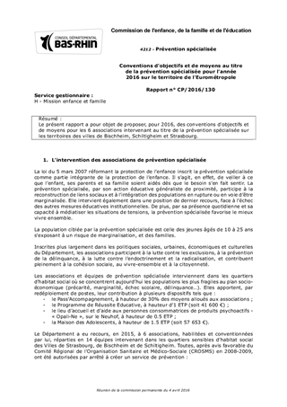 Le présent rapport a pour objet de proposer, pour 2016, des conventions d'objectifs et de moyens pour les 6 associations intervenant au titre de la prévention spécialisée sur les territoires des villes de Bischheim, Schiltigheim et Strasbourg.