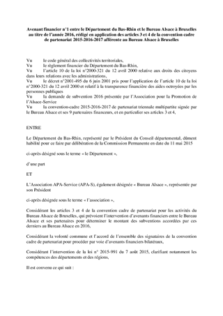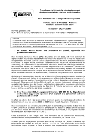 Le rapport vise à autoriser le Président du Conseil Départemental à signer l’avenant financier n°1 entre le Département du Bas-Rhin et le Bureau Alsace à Bruxelles, rédigé en application de la convention cadre de partenariat 2015-2017, et à attribuer 65 200€ à ce dernier au titre de l’année budgétaire 2016.