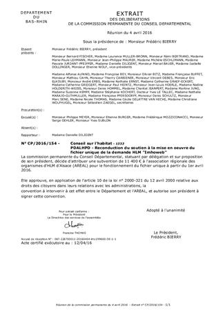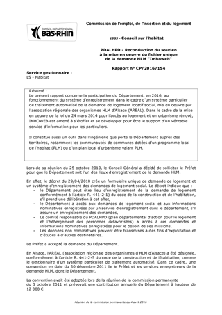 Le présent rapport concerne la participation du Département, en 2016, au fonctionnement du système d'enregistrement dans le cadre d'un système particulier de traitement automatisé de la demande de logement locatif social, mis en oeuvre par l'association régionale des organismes HLM d'Alsace (AREAL). Dans le cadre de la mise en oeuvre de la loi du 24 mars 2014 pour l'accès au logement et un urbanisme rénové, IMHOWEB est amené à s'étoffer et se développer pour être le support d'un véritable service d'information pour les particuliers. Il constitue aussi un outil dans l'ingénierie que porte le Département auprès des territoires, notamment les communautés de communes dotées d'un programme local de l'habitat (PLH) ou d'un plan local d'urbanisme valant PLH.