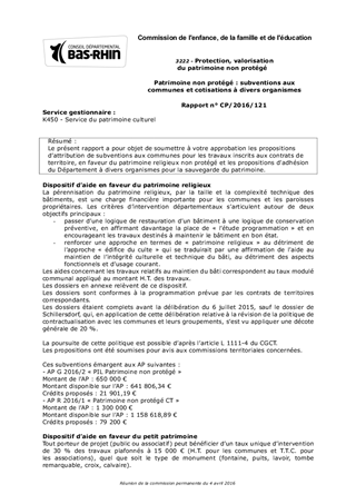 Le présent rapport a pour objet de soumettre à votre approbation les propositions d’attribution de subventions aux communes pour les travaux inscrits aux contrats de territoire, en faveur du patrimoine religieux non protégé et les propositions d'adhésion du Département à divers organismes pour la sauvegarde du patrimoine.