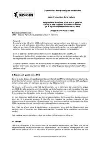 Depuis la loi du 18 juillet 1985, le Département est compétent pour élaborer et mettre en œuvre une politique de protection, de gestion et d’ouverture au public des espaces naturels sensibles. Cette politique vise prioritairement à préserver, reconquérir et valoriser des espaces qui présentent des fonctions écologiques remarquables. Dans le cadre du Schéma Départemental des Espaces Naturels (SDEN), le Département du Bas-Rhin a acquis des terrains, qu'il gère en régie et restaure afin de sauvegarder et valoriser le patrimoine naturel soit en partenariat, soit en régie. L'objet du présent rapport est d'individualiser les programmes d’actions en termes de gestion et d’études pour l’année 2016 sur les sites "Espaces Naturels Sensibles" (ENS) gérés en régie.