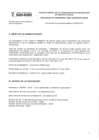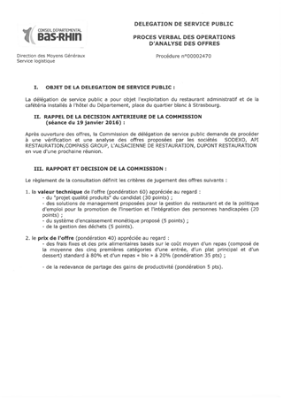 Le présent rapport a pour objet de demander à la Commission Permanente de valider le choix du délégataire dans le cadre de la procédure de délégation de service public concernant l’exploitation du restaurant administratif et de la cafétéria de l’Hôtel du Département à Strasbourg.