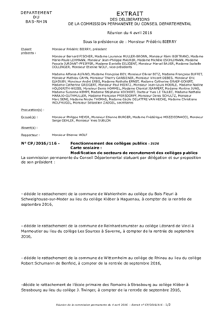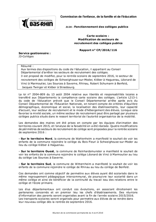 Aux termes des dispositions du code de l’éducation, il appartient au Conseil Départemental d’arrêter les secteurs de recrutement des collèges. Il est proposé de modifier, pour la rentrée scolaire de septembre 2016, le secteur de recrutement des collèges de Schweighouse-sur-Moder, Kléber à Haguenau, Léonard de Vinci à Marmoutier, Les Sources à Saverne, Rhinau, Robert Schumann à Benfeld, Jacques Twinger et Kléber à Strasbourg.