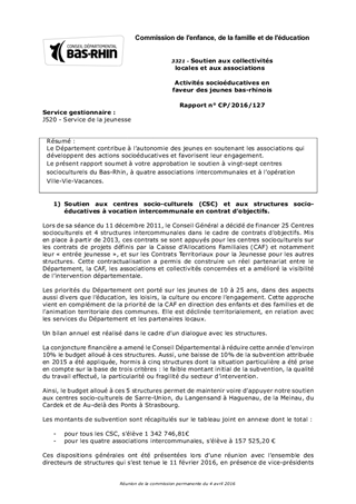 Le Département contribue à l’autonomie des jeunes en soutenant les associations qui développent des actions socioéducatives et favorisent leur engagement. Le présent rapport soumet à votre approbation le soutien à vingt-sept centres socioculturels du Bas-Rhin, à quatre associations intercommunales et à l’opération Ville-Vie-Vacances.