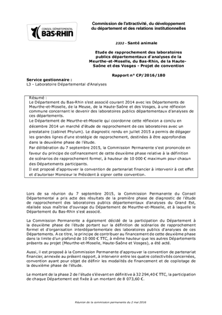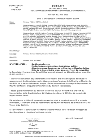 Le Département du Bas-Rhin s’est associé courant 2014 avec les Départements de Meurthe-et-Moselle, de la Meuse, de la Haute-Saône et des Vosges, à une réflexion commune concernant le devenir des laboratoires publics départementaux d'analyses de ces départements. Le Département de Meurthe-et-Moselle qui coordonne cette réflexion a conclu en décembre 2014 un marché d'étude de rapprochement de ces laboratoires avec un prestataire (cabinet Phylum). Le diagnostic rendu en juillet 2015 a permis de dégager les grandes lignes d'une stratégie de rapprochement, destinées à être approfondies dans la deuxième phase de l'étude. Par délibération du 7 septembre 2015, la Commission Permanente s'est prononcée en faveur du principe de cofinancement de cette deuxième phase relative à la définition de scénarios de rapprochement formel, à hauteur de 10 000 € maximum pour chacun des Départements participants. Il est proposé d'approuver la convention de partenariat financier à intervenir à cet effet et d'autoriser Monsieur le Président à signer cette convention.